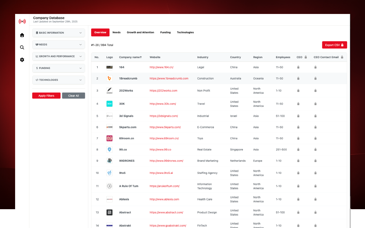 Full Access ($99/month): Everything in Monthly List plus access to our complete database of 50,000+ companies, 500 verified CEO contact credits you can use during the month.